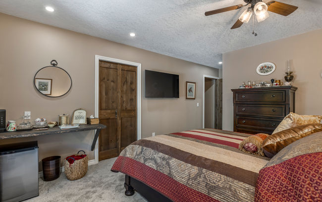 The Windsor Room blends vintage character with heartfelt detail, inspired by our own family’s roots and love for the old country. Royal keepsakes, warm tones, and classic furniture give the space a storybook feel. A private walk-out patio and elegant bathroom with walk-in shower round it out. If you’re drawn to tradition and comfort, this room delivers a classic bed and breakfast stay with personality and grace.